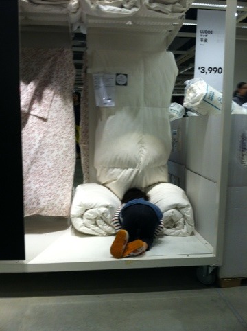 Posted on 2011/12/18 by editorsMake Yourself Right HomeWhile shopping for sheets at IKEA in Japan we found a kid sleeping in the displayShare this: Click to share on X (Opens in new window) X Click to share on Facebook (Opens in new window) Facebook Click to email a link to a friend (Opens in new window) Email Click to print (Opens in new window) Print Click to share on Reddit (Opens in new window) Reddit